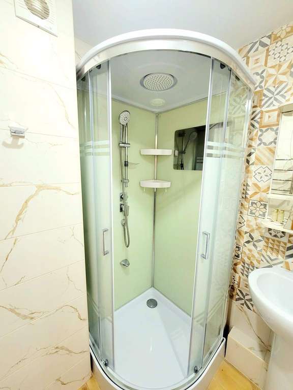 Чистейший санузел оборудован белоснежной сантехникой и душевой кабинкой с тропическим душем. В наличии все принадлежности для полноценного личного ухода гостей - от стиральной машины-автомат до фена и нужных мелочей.